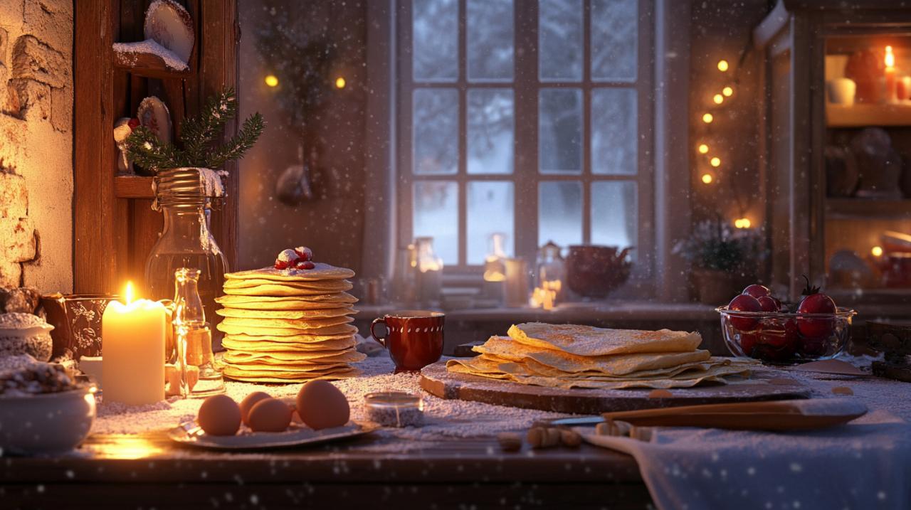 La tradition des crêpes à la Chandeleur trouve ses racines dans un symbolisme riche et multiple. Leur forme ronde et dorée évoque directement le soleil, astre nourricier dont le retour progressif était célébré par nos ancêtres. Cette association avec l'astre solaire symbolise la lumière triomphant des ténèbres et annonce la fin prochaine de l'hiver. Une croyance paysanne solidement ancrée assurait qu'en préparant des crêpes à la Chandeleur, on garantissait une bonne récolte pour l'année à venir. Cette coutume alimentaire s'inscrit ainsi dans une logique de prospérité et d'abondance, les crêpes étant préparées avec les surplus de farine disponibles à cette période de l'année. Pour réaliser environ vingt crêpes dans une crêpière de trente centimètres, la recette traditionnelle nécessite cinq cents grammes de farine, deux cent cinquante grammes de sucre en poudre, trois œufs, un litre de lait, vingt-cinq grammes de beurre, un sachet de sucre vanillé et une pincée de sel. Cette simplicité des ingrédients témoigne du caractère populaire et accessible de cette tradition culinaire.